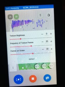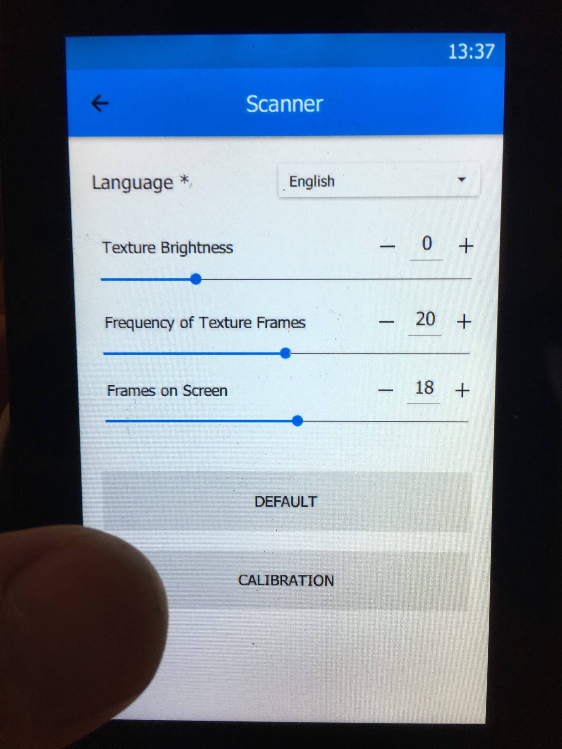 Calibry 3D-skanneri pyytää kalibrointia aika tasaisin väliajoin. Kalibrointi löytyy, kun skannerin näytön vasemmasta yläkulmasta painaa kolmen viivan kohdalta. Tämän jälkeen sivuvalkosta painetaan kohdasta Scanner. Tämän toiminnon alta paikentaan kohdasta Calibration. Calibration:in alta painetaan Start. Kalibrointi tehdään 7 kohdan kalibroinnilla. Alkuun asetetaan skanneri noin 50cm päähän kalibrointi levystä. Vasemmassa sivussa näkyy tummemmalla harmaalla skannerin etäisyys ja vaaleammalla, missä kohtaan skannerin pitää olla. Tummat ympyrät ja orannissit pitää kohdata.