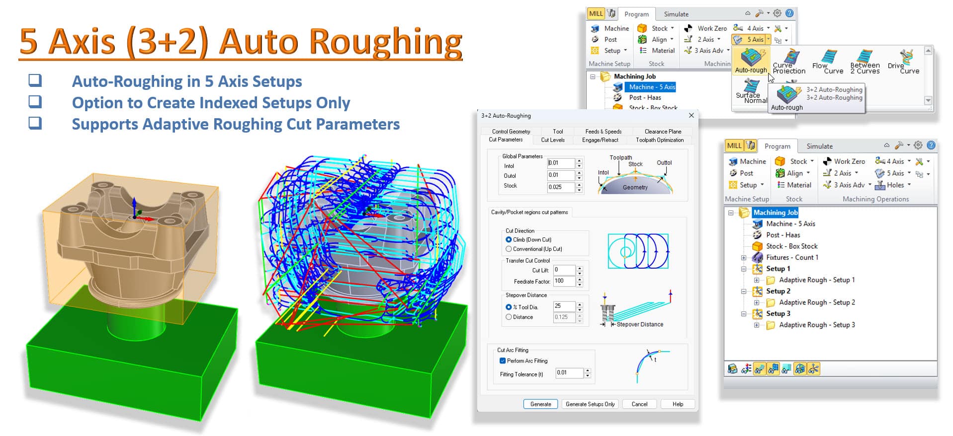 MecSoft CAM -ohjelmiston vuoden 2026 julkaisussa esitelty 5-akselinen 3+2 automaattinen rouhintamenetelmä on automaattinen indeksointimoduuli, joka on suunniteltu yksinkertaistamaan monimutkaisten monisivuisten osien rouhintaa 5-akselisella koneella. Katso tämän automatisoidun työstöradan tärkeimmät tiedot alta.