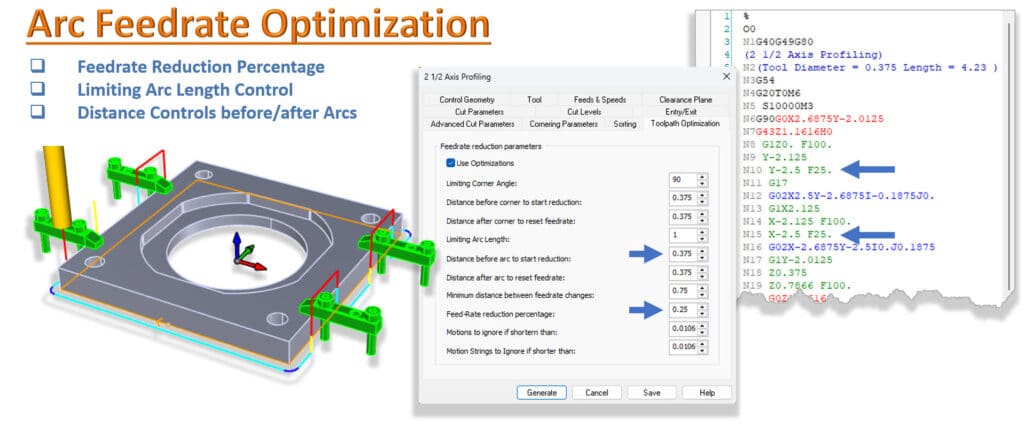 • Hidastus ennen kaaren alkua: Käyttäjät voivat nyt määrittää “matkan, joka on lyhennettävä ennen” kaaren alkua. Tämä käskee konetta hidastamaan tiettyyn prosenttiosuuteen leikkaussyöttönopeudesta ennen kuin työkalu todella osuu käyrään.