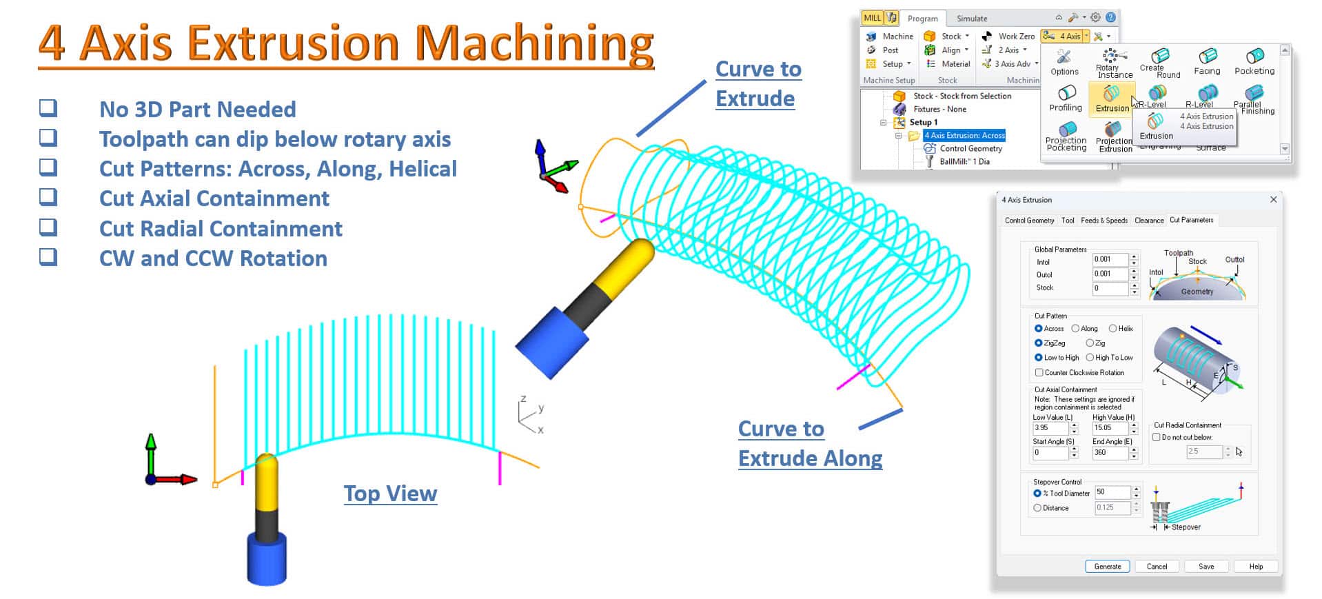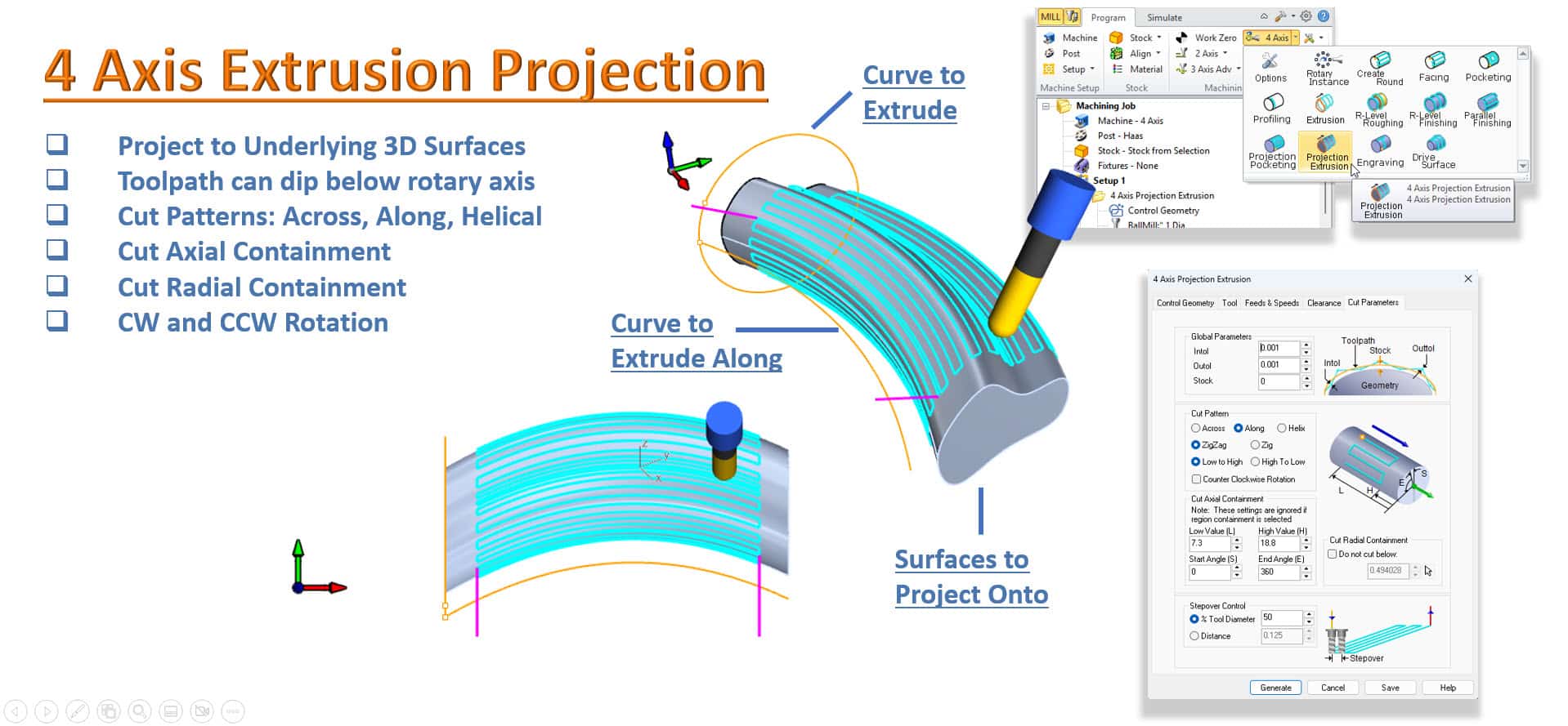 Molemmat toiminnot sijaitsevat ohjelmiston 4-akselisessa valikossa kohdassa Program > 4-Axis > Extrusion & Projection Extrusion