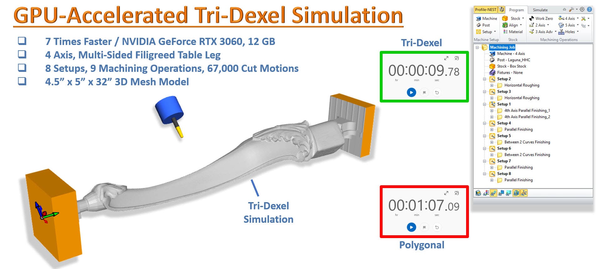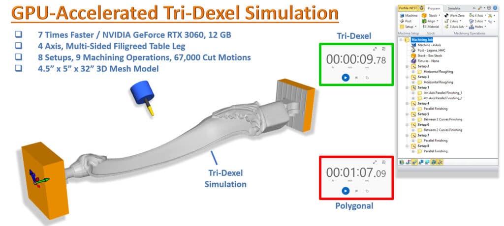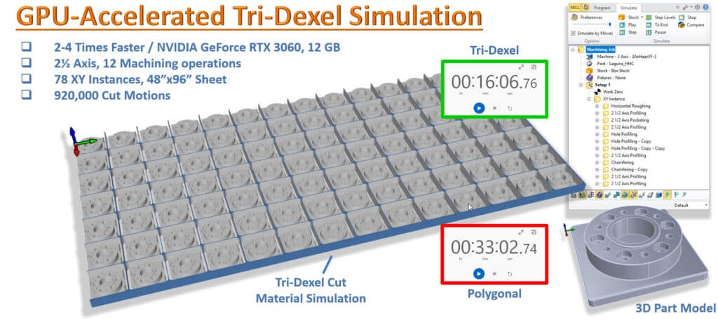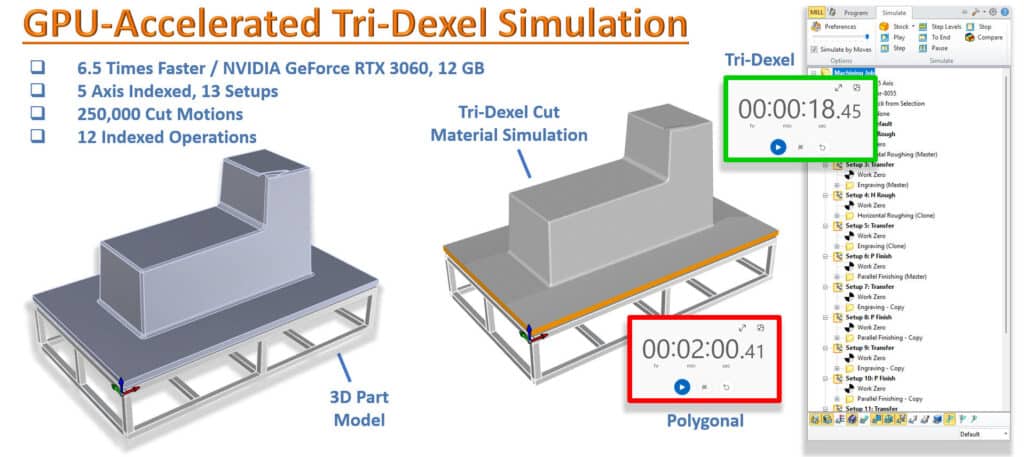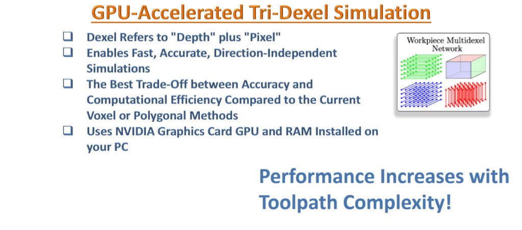 Versio 2026 tuo mukanaan merkittävän suorituskyvyn parannuksen MecSoft CAM:iin: GPU-kiihdytetyn Tri-Dexel-simuloinnin. Tämä uusi moduuli hyödyntää modernia grafiikkalaitteistoa lyhentääkseen merkittävästi materiaalinpoiston visualisointiin tarvittavaa aikaa. Katso GPU-kiihdytetyn “Tridexel”-simuloinnin parannuksen tärkeimmät tiedot alta.