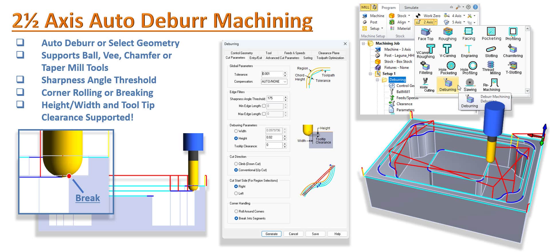 MecSoft CAM -ohjelmiston vuoden 2026 julkaisussa esitellään uutena ominaisuutena 2½-akselinen automaattinen purseenpoisto. Se on suunniteltu tunnistamaan ja rikkomaan automaattisesti kappaleen terävät reunat turvallisemman ja viimeistellymmän tuotteen luomiseksi. Katso 2½-akselisen automaattisen purseenpoiston työstöradan tärkeimmät tiedot alta.