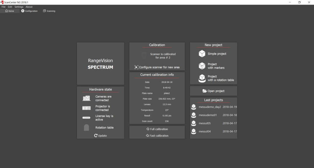 Homma alkaa sillä, että ensin kytketään skanneri, sekä ohjelmiston suoja-avain tietokoneeseen ja sen jälkeen käynnistetään ohjelmisto. Ohjelmisto tunnistaa automaattisesti kytketyn 3D-skannerin ja tarkistaa, onko ohjelmistoon saatavilla päivityksiä. Sellainen huomio, että kun omistaa RangeVision 3D-skannerin, niin skannausohjelmiston päivityksistä ei tarvitse maksaa mitään. RangeVision 3D-skannerin käyttäjillä on aina käytössään uusin mahdollinen versio skannausohjelmistosta.