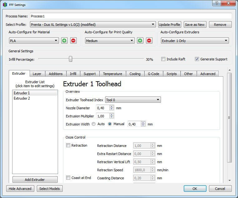 Aloitettiin Recreus Filaflex joustavien filamenttien myynti. Pari sanaa, kuinka tulostetaan joustavaa filamenttia käyttäen Simplify3D 3D-tulostusohjelmaa sekä Prenta DUO XL 3D-tulostinta. Ennen myyntiin ottamista tilattiin näyteet, haettiin Simplify3D:lla oikeat asetukset ja lämpötilat. Pidemmittä itse asiaan eli Recreus Filaflex joustavan filamentin käyttö.