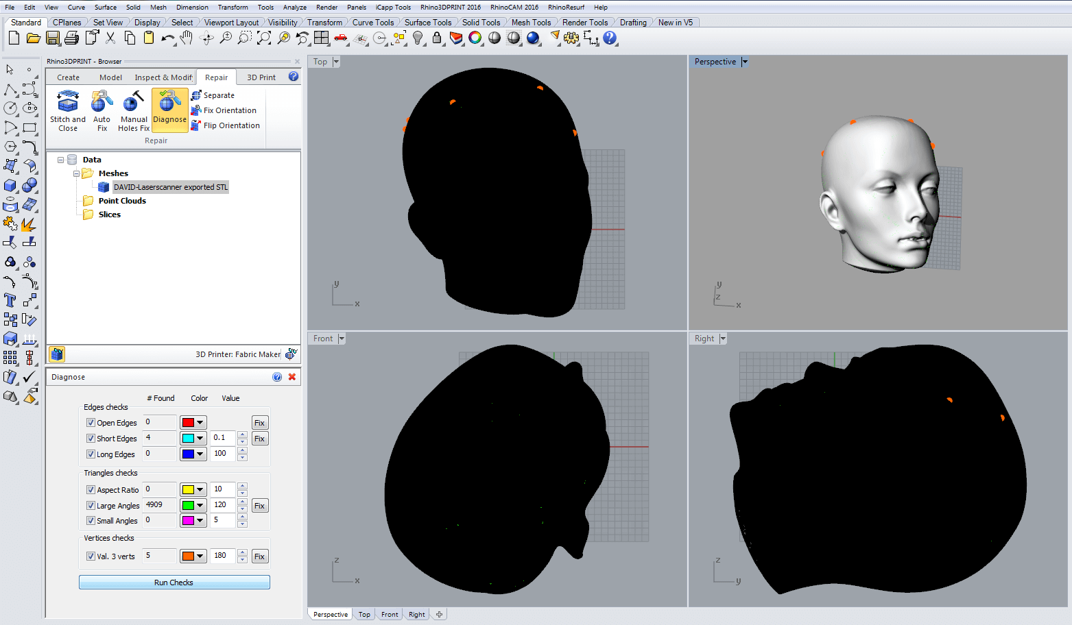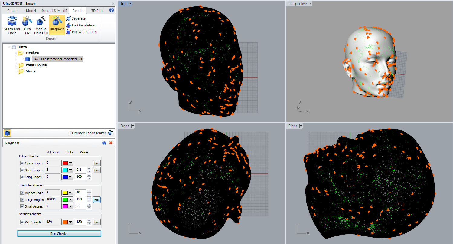 Ensimmäisenä Repair välilehdeltä valitsen Diagnose työkalun ja klikkaan Run Checks. Tällä pääsee tarkistamaan mikä on 3D-mallin tilanne. Kuten kuvasta nähdään, niin vaikka 3D-malli on tullut 3D-skannerilta, niin se on todella hyvä. Vain pientä korjattavaa löytyy.
