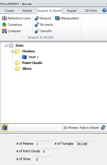 Kun 3D-malli on korjattu, niin päästään seuraavaan vaiheeseen, eli vähentämään kolmioita. Inspect & Modify välilehdellä on työkalu Reduce. Tässä on kaksi vaihtoehtoa kolmioiden vähennykseen. Joko määritetään suurin heitto tai annetaan vähennysluku prosentteina. Tässä tapauksessa käytin prosentteina 75.