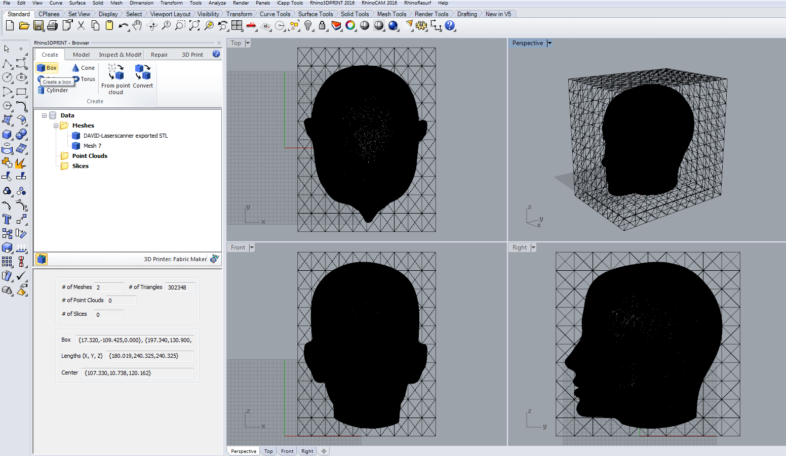 Rhino3DPRINT tehostaa työskentelyä huomattavasti, kun työskentelee 3D-skannerien ja 3D-tulostinten kanssa. Rhino3DPRINT pystyy työstämään myös pistepilviä.
