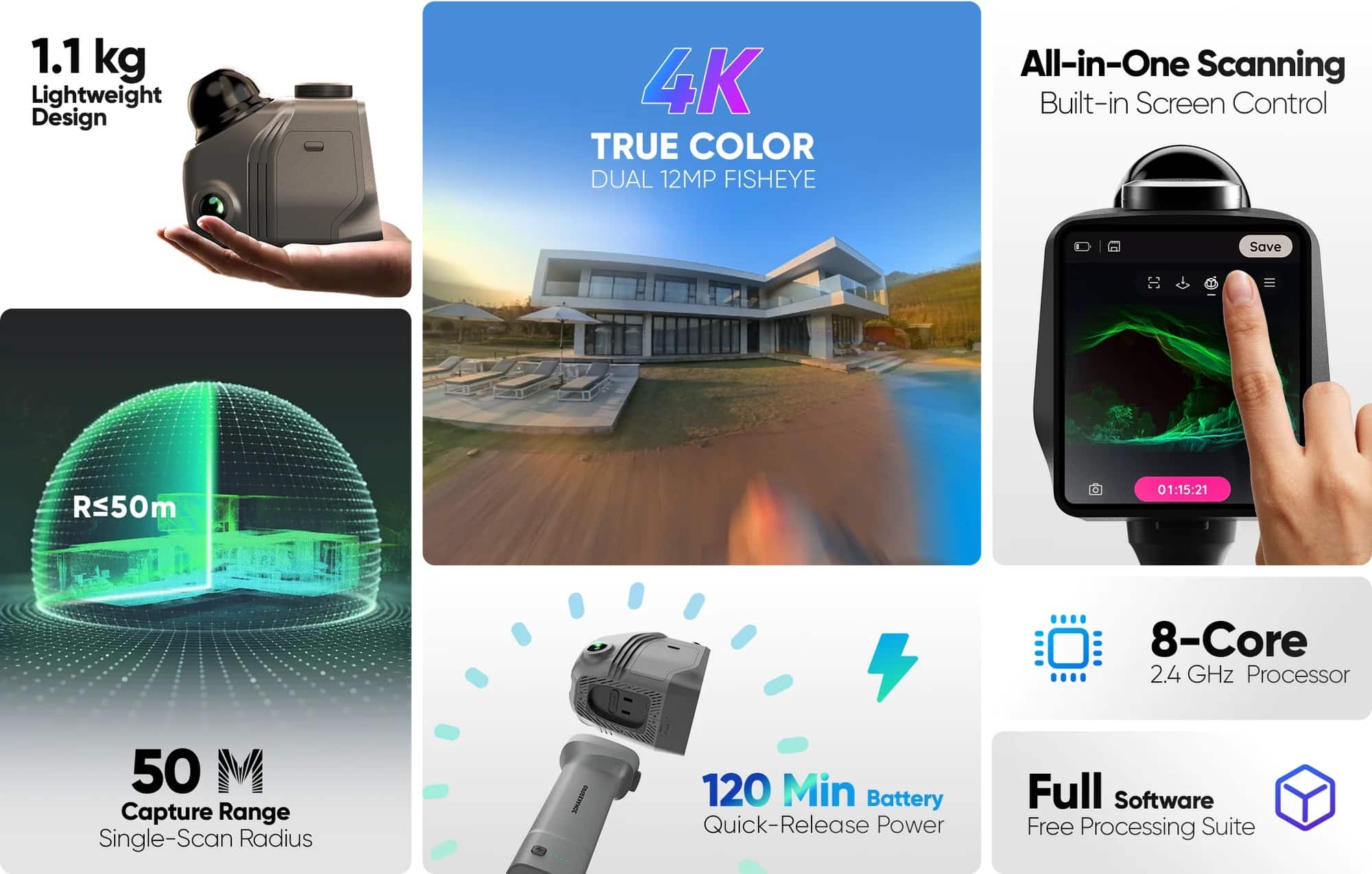 Vain 1,1 kg painava Raven on suunniteltu kannettavuutta ja kestävyyttä silmällä pitäen. “Swap & Go” -akkujärjestelmässä on irrotettava 12 000 mAh:n akkukahva, jonka avulla voit vaihtaa virtalähteen nopeasti ja jatkaa työskentelyä suurissa projekteissa ilman keskeytyksiä. Vankan rakenteensa ja monipuolisten kiinnitysvaihtoehtojen – mukaan lukien dronetuen – ansiosta Raven on luotettava työkalu arkkitehdeille, insinööreille ja digitaalisille taiteilijoille, joiden on tallennettava maailma kolmiulotteisena.