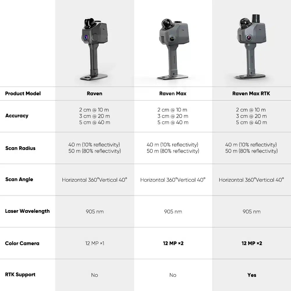 Vastatakseen eri alojen vaatimuksiin Raven on saatavilla kolmena eri kokoonpanona. Standard-malli tarjoaa vankan lähtökohdan geometrian tallennukseen ja skannaukseen, kun taas Max-versio parantaa lopputulosta korkealaatuisilla tekstuureilla integroidun kameransa ansiosta. Niille, jotka vaativat äärimmäistä tarkkuutta, Max RTK -versio sisältää ulkoisen 360 asteen kameran. Tämä mahdollistaa täysin upottavan värien tallennuksen ja entistä korkeamman resoluution 3D Gaussian Splatting (PLY) -tulokset, jotka sopivat täydellisesti elokuvallisiin VR- ja AR-sovelluksiin.