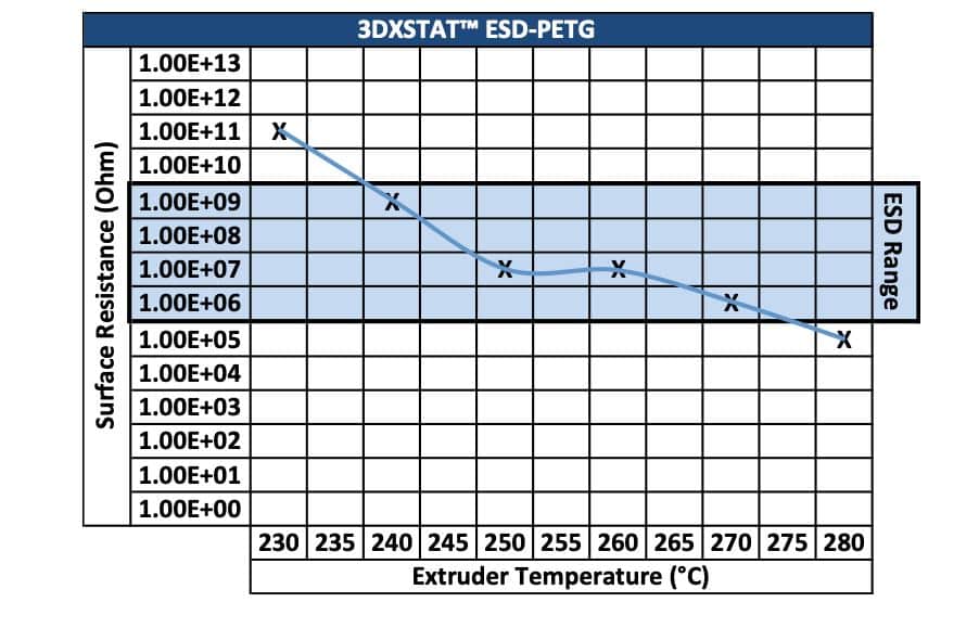 Tulostetun ESD-suojatun osan pintavastus vaihtelee tulostimen ekstruuderin lämpötilan mukaan. Jos esimerkiksi testaus osoittaa, että osa on liian eristävä, suuttimen lämpötilan nostaminen parantaa johtavuutta. Siksi pintavastus voidaan “valita sisään” säätämällä suuttimen lämpötilaa ylös tai alas saamasi lukeman mukaan.