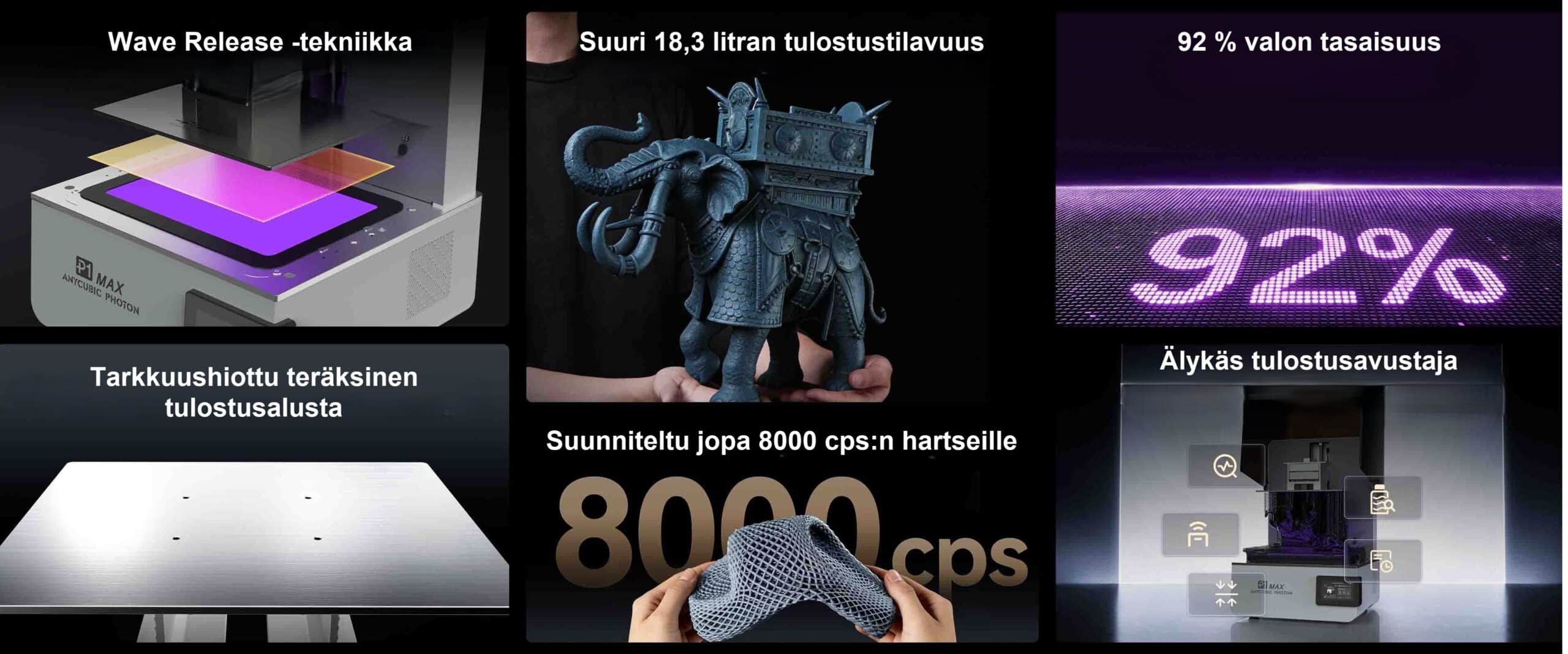 Kaksoisverkkoyhteyden (Wi-Fi + Ethernet), Anycubic-sovelluksen kautta tapahtuvan etävalvonnan sekä erittäin sitkeiden 8000 cps:n hartsien tuen ansiosta Photon P1 Max tarjoaa saumattoman, älykkään ja tuotantovalmiin käyttökokemuksen.