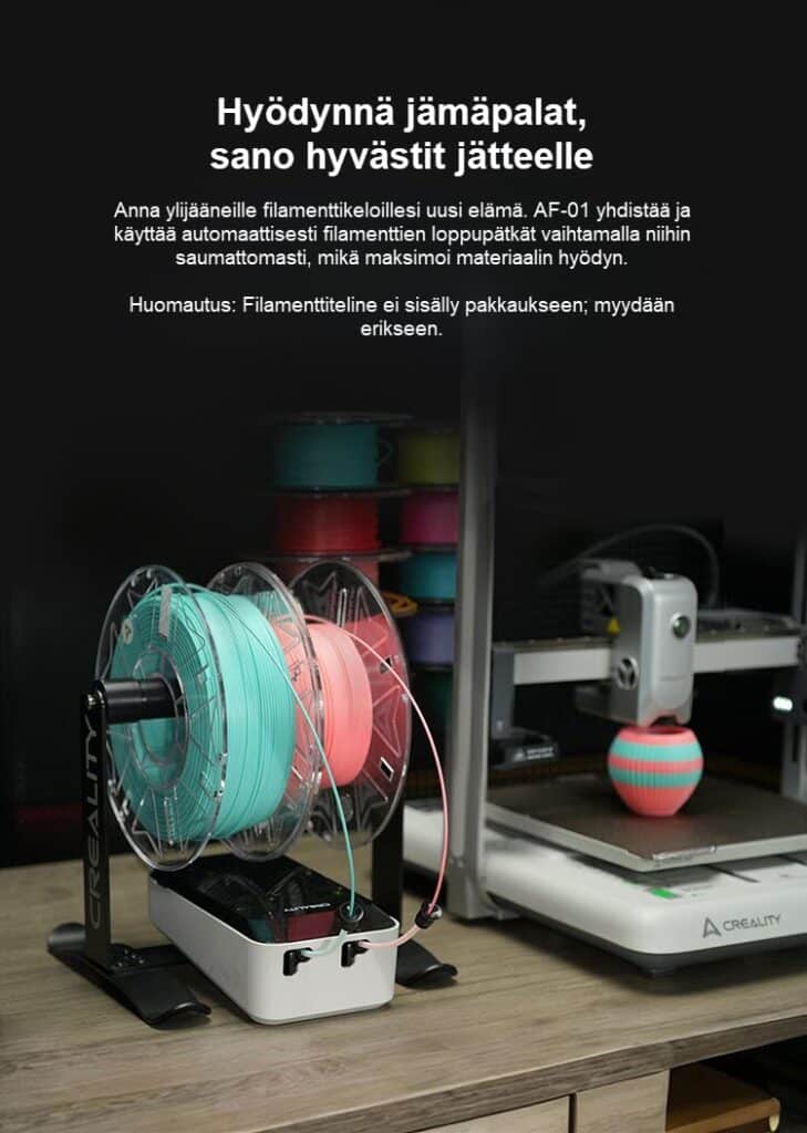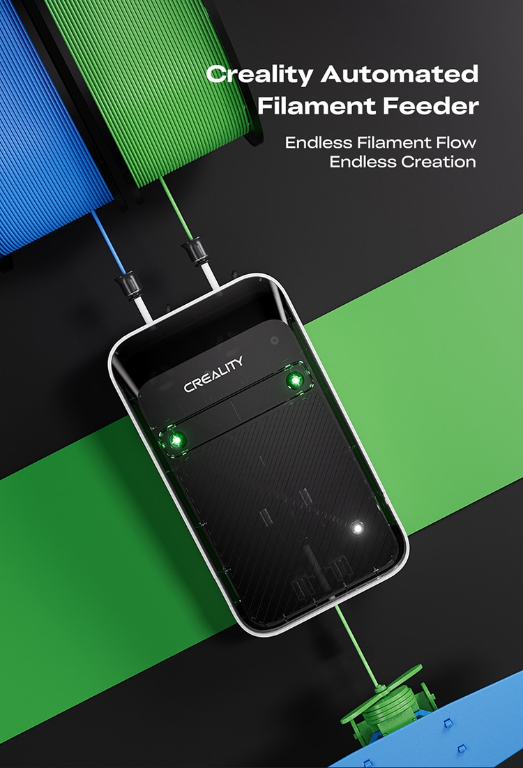 Creality automaattinen filamentin syöttölaite on suunniteltu tekemään materiaalin käsittelystä tehokkaampaa, luotettavampaa ja vähemmän aikaa vievää. Tukemalla jatkuvaa materiaalivirtaa, automaattista täydennystä ja älykästä tunnistusta, se auttaa vähentämään keskeytyksiä tulostuksen aikana ja parantaa yleistä työnkulkua. Se mahdollistaa myös jämäfilamenttien tehokkaamman hyödyntämisen ja tukee moniväritulostusta. Korkean vääntömomentin ekstruuderin ja laajan yhteensopivuuden ansiosta se tarjoaa käytännöllisen ratkaisun päivittäiseen 3D-tulostukseen.