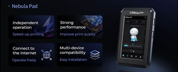 Creality Nebula Pad on 4.3 tuuman kosketusnäyttö, joka käyttää Creality OS käyttöjärjestelmää, jossa on kaksiytiminen suoritin. Nebula Padin avulla voit ohjata tulostinta erittäin joustavasti – voit käyttää kosketusnäyttöä, älypuhelinta tai PC:tä, kuten haluat. Yhdessä Nebula kameran kanssa sinulla on myös mahdollisuus reaaliaikaiseen etävalvontaan – milloin tahansa ja mistä tahansa!