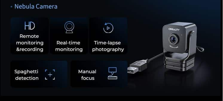 Creality Nebula -kamera on korkearesoluutioinen USB-kamera, jossa on monipuoliset toiminnot. 24 tunnin reaaliaikaisen seurannan ja time-lapse-kuvauksen lisäksi kamerassa on spagettitunnistustoiminto ja manuaalisesti säädettävä tarkennus.