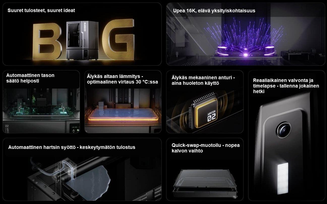 Elegoo Jupiter 2 3D-tulostin on tehokas suuren koon hartsitulostin (Resin 3D), joka on suunniteltu käyttäjille, jotka tarvitsevat sekä suuren tulostusalan että äärimmäistä tarkkuutta. Sen laajan tulostustilavuuden ja erittäin korkean 16K-resoluution ansiosta se tuottaa erittäin yksityiskohtaisia tulosteita suuressa koossa. Älykkäät automaatio-ominaisuudet yksinkertaistavat työnkulkua ja tekevät vaativasta tulostamisesta helpommin lähestyttävää. Se on vahva valinta ammattilaisille, jotka työskentelevät prototyyppien valmistuksen, tuotannon tai yksityiskohtaisen suunnittelun parissa.