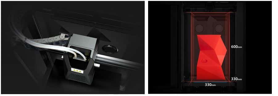 - Tulostustilavuus: Yksi suutin: 330 x 330 x 600mm; kaksi suutinta: 300 x 330 x 600mm