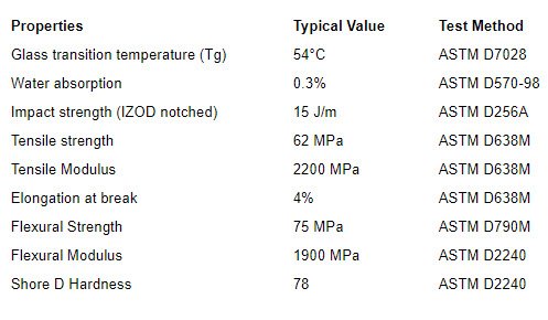 Huomaa, että edellä esitetyt arvot voivat vaihdella koneen käsittelyn, jälkikovetteisten osien, geometrian, tulostussuunnan, tulostusasetusten ja lämpötilan mukaan.