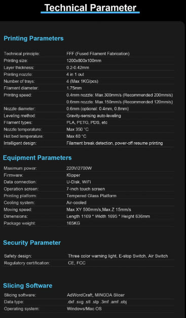 AD-F4 tarjoaa vaikuttavan 800 × 1200 × 100 mm:n tulostusvolyymin, joten se sopii erinomaisesti suurten kylttien, kanavakirjainten ja mainosmallien tuottamiseen. Sen IMS (Intelligent Multi-color System) -nelivärinen pursotus mahdollistaa saumattomat siirtymät värien välillä, mikä mahdollistaa eloisien, moniväristen tulosteiden luomisen ilman manuaalisia filamenttien vaihtoja.