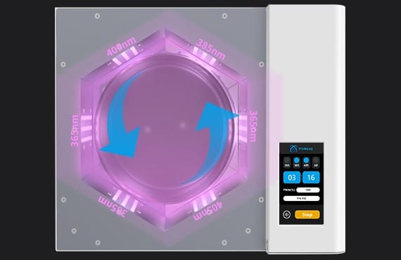 Kovetuskammio on varustettu monisuuntaisella UV-valaistuksella ja heijastavilla pinnoilla, jotka jakavat valon tasaisesti mallin ympärille. Tämä kattava valotus varmistaa, että jokainen pinta kovettuu yhtenäisesti, mikä vähentää heikkoja kohtia ja parantaa valmiin osan mekaanisia ominaisuuksia.