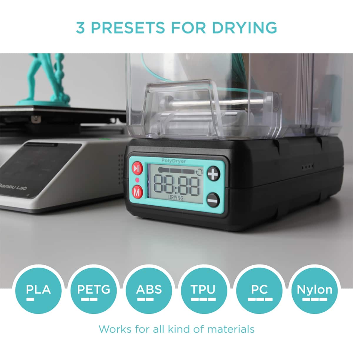 Kolmen kuivaustason ja mukautettavien aika-asetusten ansiosta PolyDryer telakka mukautuu eri filamenttityyppeihin ja projektien tarpeisiin. 360 asteen kuivausjärjestelmä varmistaa tasaisen lopputuloksen ja vähentää kosteudesta johtuvia tulostusongelmia.