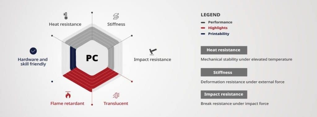 PC eli polykarbonaatti on yksi edistyksellisistä teollisista kestomuoveista, joka on erittäin sitkeää, kestävää ja erittäin lujaa. PC tunnetaan suuresta iskunkestävyydestään, ja sitä käytetään yleisesti jäykkien osien valmistukseen. PC:llä on myös hyvä lämmönkestävyys jopa 110 °C:seen asti, joten se on täydellinen metallien korvike korkeissa lämpötiloissa (esim. ajoneuvon konepellin alla). PC:llä tulostettuja osia käytetään pääasiassa toimintojen testauksen myöhemmissä vaiheissa ja valmiiden osien kokoonpanossa. Tulostettuja PC-osia on käytetty menestyksekkäästi valmistussovelluksissa jälkiviimeistelyn kanssa tai ilman sitä.