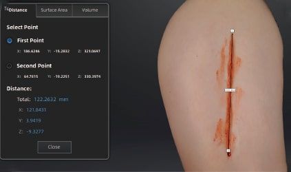 *Volumetrinen tarkkuus viittaa 3D-tietojen tarkkuuden ja objektin koon väliseen suhteeseen. Tarkkuus pienenee 0,1mm per 100cm (vakioskannaus ja kehoskannaus). Johtopäätös saadaan mittaamalla pallon keskipiste merkkien kohdistuksen alla.