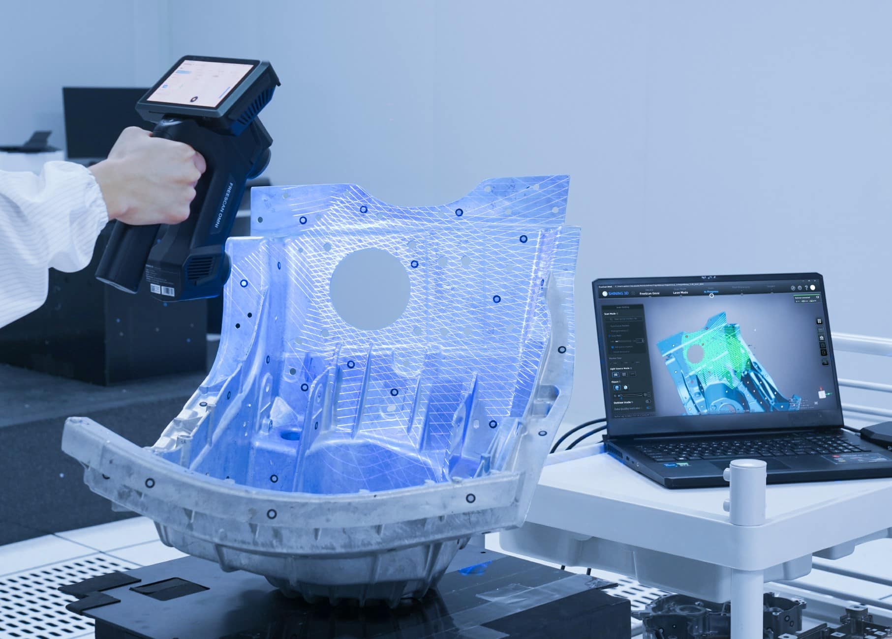 Shining3D FreeScan Omni 3D-skanneri. FreeScan Omni mullistaa kädessä pidettävän 3D-metrologian skanneriin kiinnitettävällä tarkastusominaisuudellaan ja langattomalla, itsenäisellä suunnittelullaan. Tuotantotilojen tarkastuksista metrologian laboratoriomittauksiin ja kenttätyöhön liikkeellä ollessa, FreeScan Omni tarjoaa johdonmukaista suorituskykyä kaikkialla, missä sitä tarvitaan.