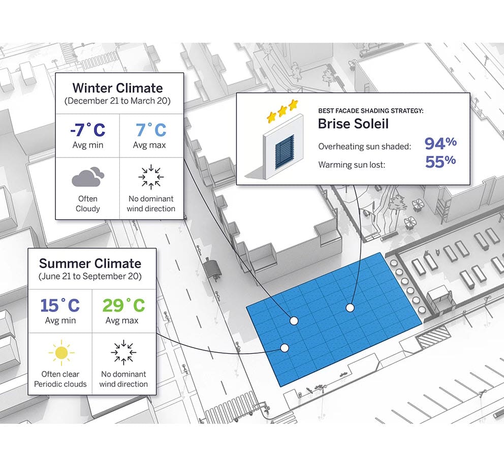 Tunnista nopeasti tehokkaimmat varjostusratkaisut sekä lasipinnan lisäämisestä koituvaat vaikutukset ja hyödyt rakennuksen jokaisella julkisivulla.